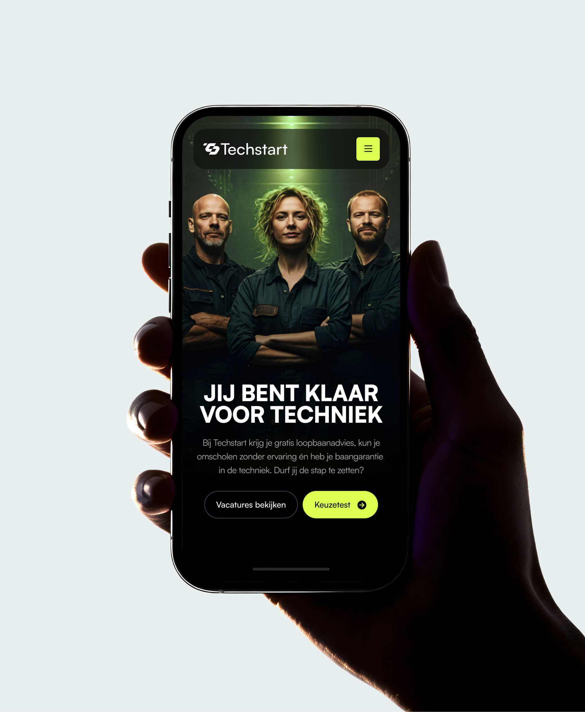 Vanaf het eerste gesprek was duidelijk: Techstart wil verder gaan dan een vacaturebank. Ze wilden een platform waar mensen hun skills kunnen ontdekken en direct matchen met banen in de techniek. Ik werkte het hele traject uit, van concept en wireframes tot een werkend prototype, de one-pager en uiteindelijk het complete website-ontwerp.